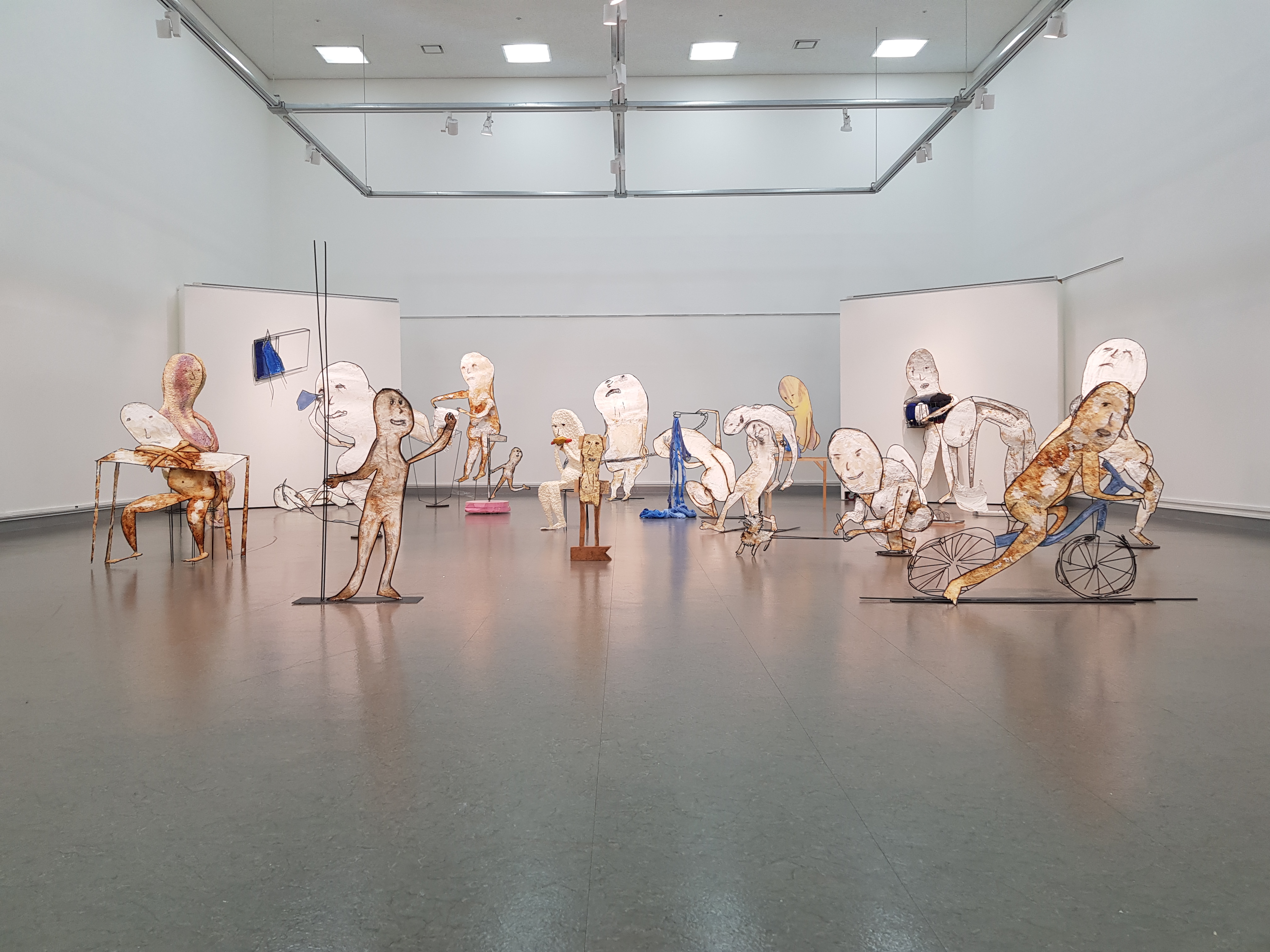 이 작업들은 꽤 튼튼한 뼈대를 지니고 있지만, 막상 표현된 인물들은 뼈가 없는 사람처럼 물렁해 보인다. 딱히 마디가 구분되지 않은 몸에는 흐늘거리는 율동감이 있다. 방향을 조금만 틀면 얇디얇은 옆면이 보이는데, 이 가느다란 두께는 작가가 구현하고자 했던 “평면이 서 있는 것 같은 느낌”을 가능하게 한다. 부피에 비해 희미한 중량감은 이 군상들에게 가벼운 활기를 부여하고 있다. 종이 위의 그림이 뒷면을 전혀 고려하지 않는 것 같이, 그의 조각 역시 뒷면은 아무런 특징 없이 텅 비어 있다. 오직 정면을 위해 존재하는, 드로잉이라기엔 입체적이고 조각이라기에는 평면적인 인물들. 그리고 그들의 둥그런 몸은 그것들에게 존재하지 않는 뼈를 도리어 연상하게 하듯 하얗다. 하지만 이내 몇몇 조각의 몸에서 얼룩 같은 흔적을 발견할 수 있다. 이 노르스름한 자국은 작가가 드로잉에서 자주 사용하곤 했던 색채와 비슷하게 보이지만, 작품에 녹이 슬면서 우연히 생겨났다고 한다. 나무의 나이테처럼 시간의 흐름을 무늬로 새긴 조각들.